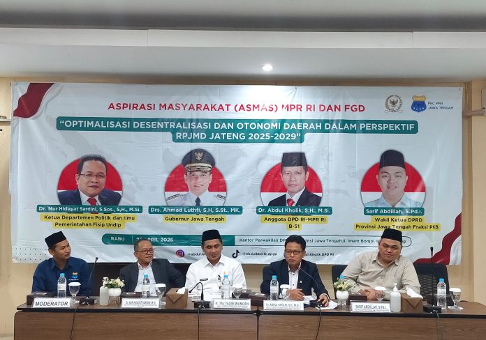 “Tiga sektor tersebut merupakan suatu hal yang penting sebagai kekuatan yang bisa membuat pembangunan Jawa Tengah lebih berkembang,” tutur Senator Abdul Kholik dalam acara Focus Group Discussion (FGD) “Optimalisasi Desentralisasi dan Otonomi Daerah dalam Perspektif RPJMD Jateng 2025-2029″ yang dilaksanakan di Kantor DPD RI Perwakilan Jateng, Rabu (23/4/2025).
