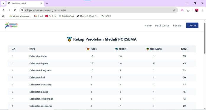 WONOSOBO, Harianjateng.com – Pekan Olahraga dan Seni Ma’arif (Porsema) XIII Lembaga Pendidikan Ma’arif NU PWNU Jawa Tengah yang digelar di Wonosobo memasuki hari terakhir dengan persaingan sengit antarkontingen. Hingga Sabtu (13/9/2025) pagi pukul 07.00 WIB merujuk laman https://infoporsema.maarifnujateng.or.id/medali, rekapitulasi medali sementara menunjukkan dominasi Kabupaten Kudus dan Kabupaten Jepara.