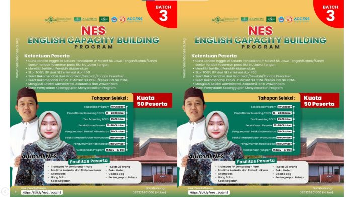 Semarang, Harianjateng.com – Lembaga Pendidikan Ma’arif Nahdlatul Ulama (LP Ma’arif NU) dan Rabithah Ma’ahid Islamiyah Nahdlatul Ulama (RMI NU) Pengurus Wilayah Nahdlatul Ulama Jawa Tengah kembali membuka kesempatan bagi para guru dan ustadz untuk meningkatkan kemampuan berbahasa Inggris melalui program NES English Capacity Building Batch 3. Kegiatan ini merupakan hasil kerja sama antara LP Ma’arif NU – RMI NU PWNU Jawa Tengah dengan Yayasan NASIMA Semarang dan Access English School Pare, yang selama ini konsisten mendukung peningkatan kompetensi pendidik Ma’arif dan pesantren di bidang bahasa.